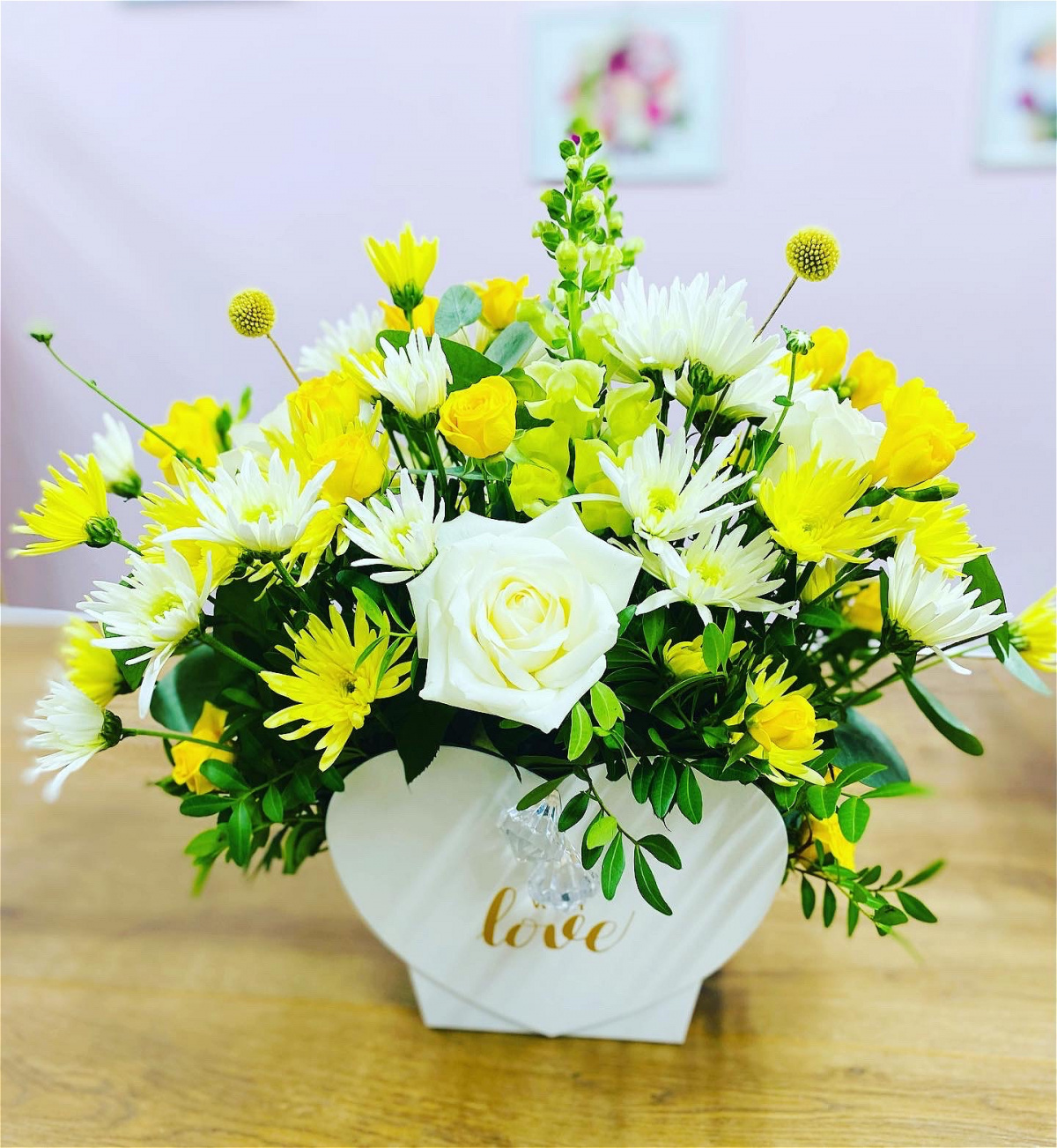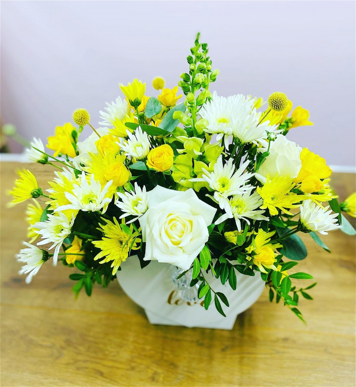 White roses ,Craspedia ,chrysanthemums